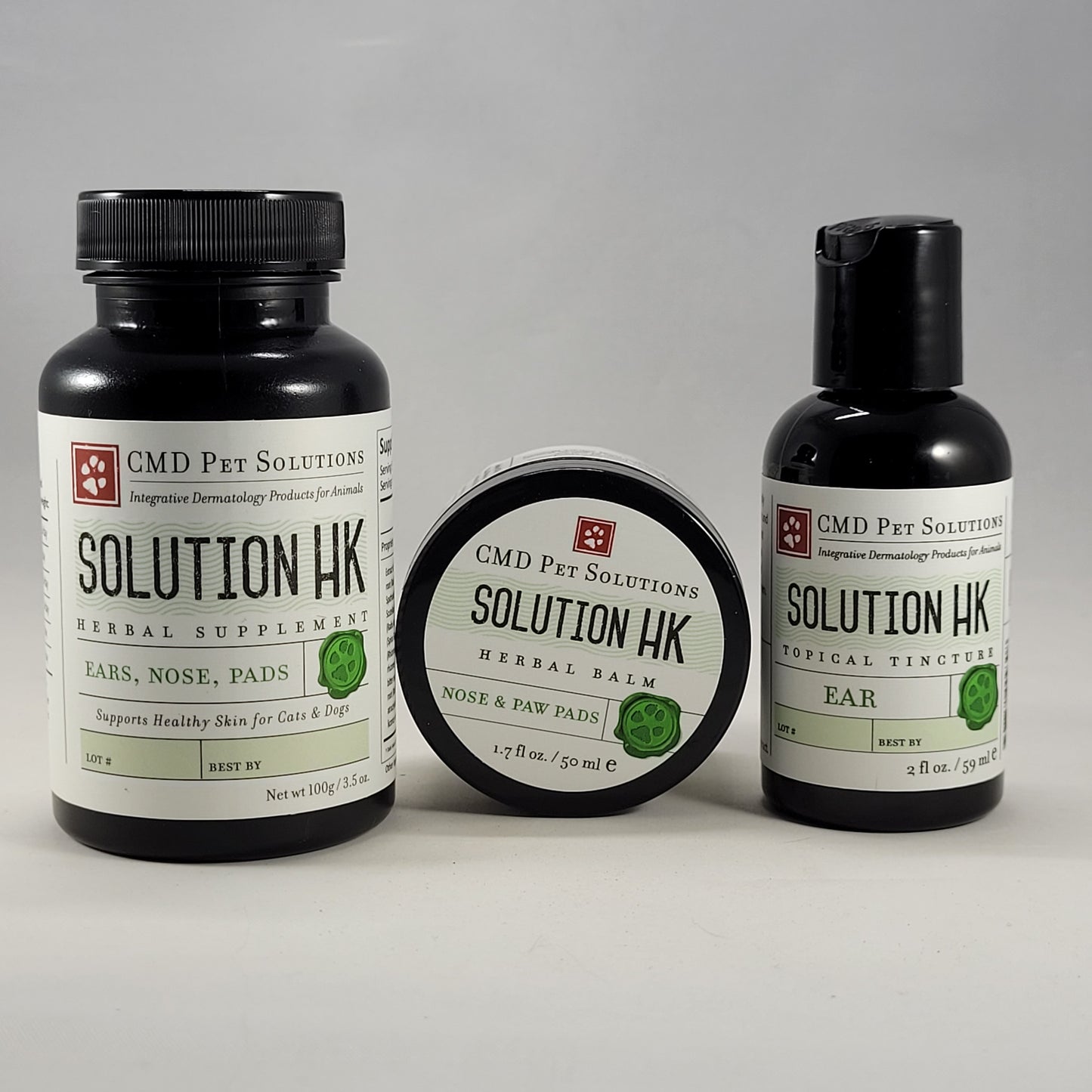 CMD Pet Solutions external products are designed to be used in conjunction with a matching herbal supplement for best results. SOLUTION HK: NOSE & PAW PADS Herbal Balm can be combined with the internal skin support of SOLUTION HK: EARS, NOSE, PADS herbal supplement.