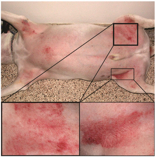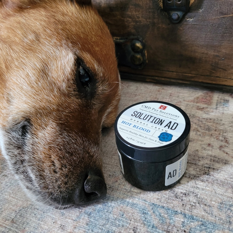Active, chronic, red, dry, itchy dermatitis: CMD Pet Solutions formulates several natural topical products to help support healthier skin in animals that suffer with atopic dermatitis. Solution AD: Hot Blood Cream is appropriate if your pet suffers from dry type eczema. In this type of dermatitis, the skin itches, is red, flaky and there might be red bumps (papules). Sometimes pet owners will see dry bloody scabs where their pet has scratched or bitten themselves (to stop the itch). Itching can be worse in the evenings or night when the pet lies down to sleep. In these presentations, there is no golden yellow crusting, no pustules, no oozing.