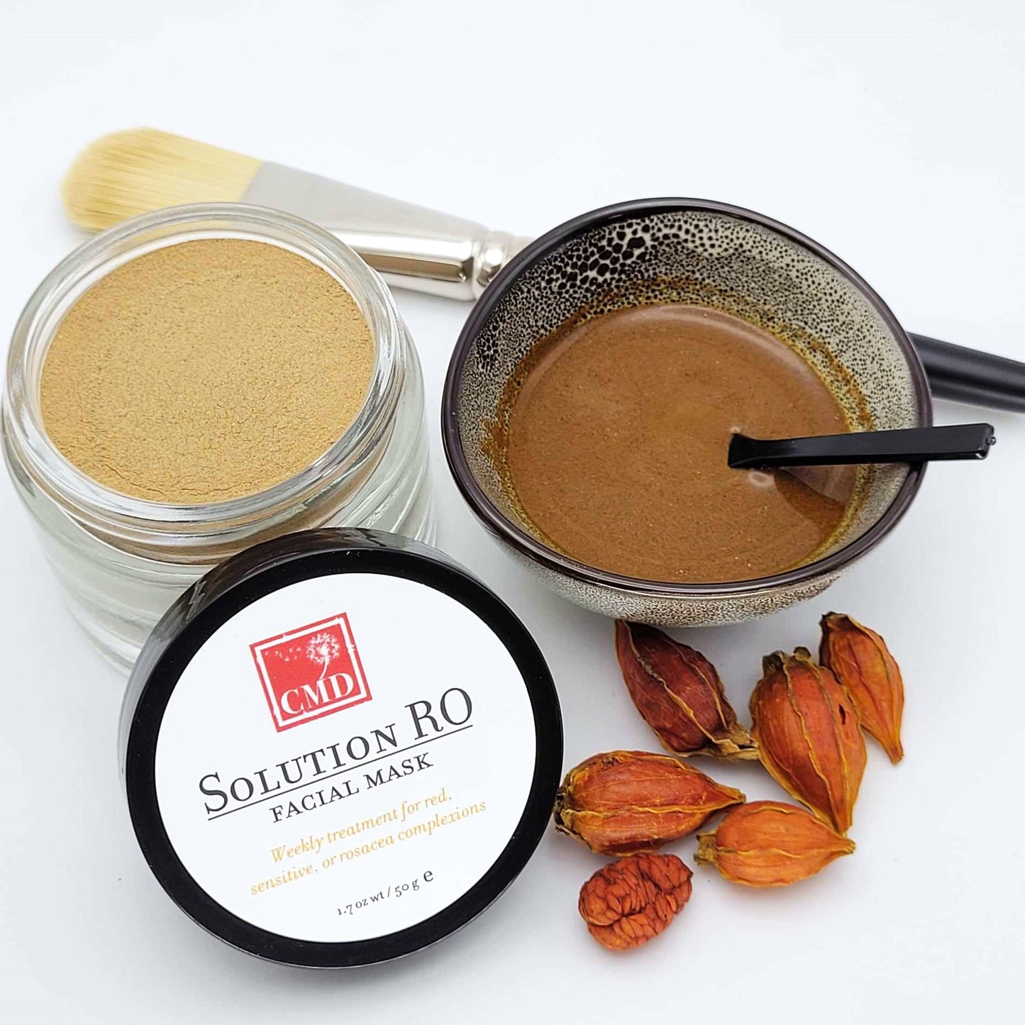 In a small bowl or cup, mix approximately 1 tsp powder with enough liquid (water, coconut milk, milk, half & half, yogurt, or carrot juice, etc.) to blend into a paste. Aim for the consistency of a fresh can of paint – not too watery and not too thick. Use fingers or cosmetic mask brush to apply paste to clean face and neck. Avoid eyes. Allow 15 minutes to dry. Soften with warm, damp cloth or a few splashes of water before gently rinsing off. Follow up with our matching Solution RO Topical Tincture then Solution RO Facial Crème. Use Facial Mask once or twice per week for best results.